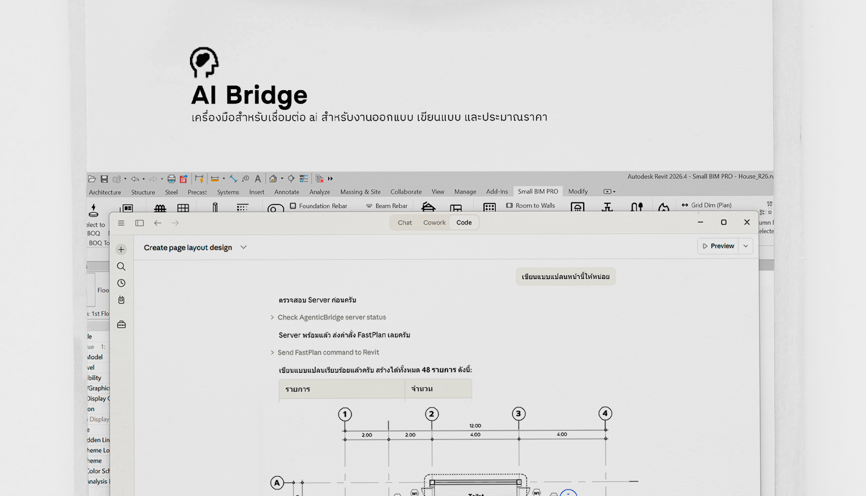 คำสั่งเชื่อมต่อ AI และ Small BIM PRO เข้าไว้ด้วยกัน โดยการทำงานจะเป็นการเปิด Localhost เพื่อให้ AI สามารถสั่งคำสั่งผ่าน Localhost เพื่อให้ Small BIM PRO ตรวจจับแล้วสร้างคำสั่งตามที่ผู้ใช้งานสั่งงานได้ทันที แต่ยังอยู่ในช่วงทดสอบเท่านั้น อาจจะยังใช้งานได้ไม่เต็มที่